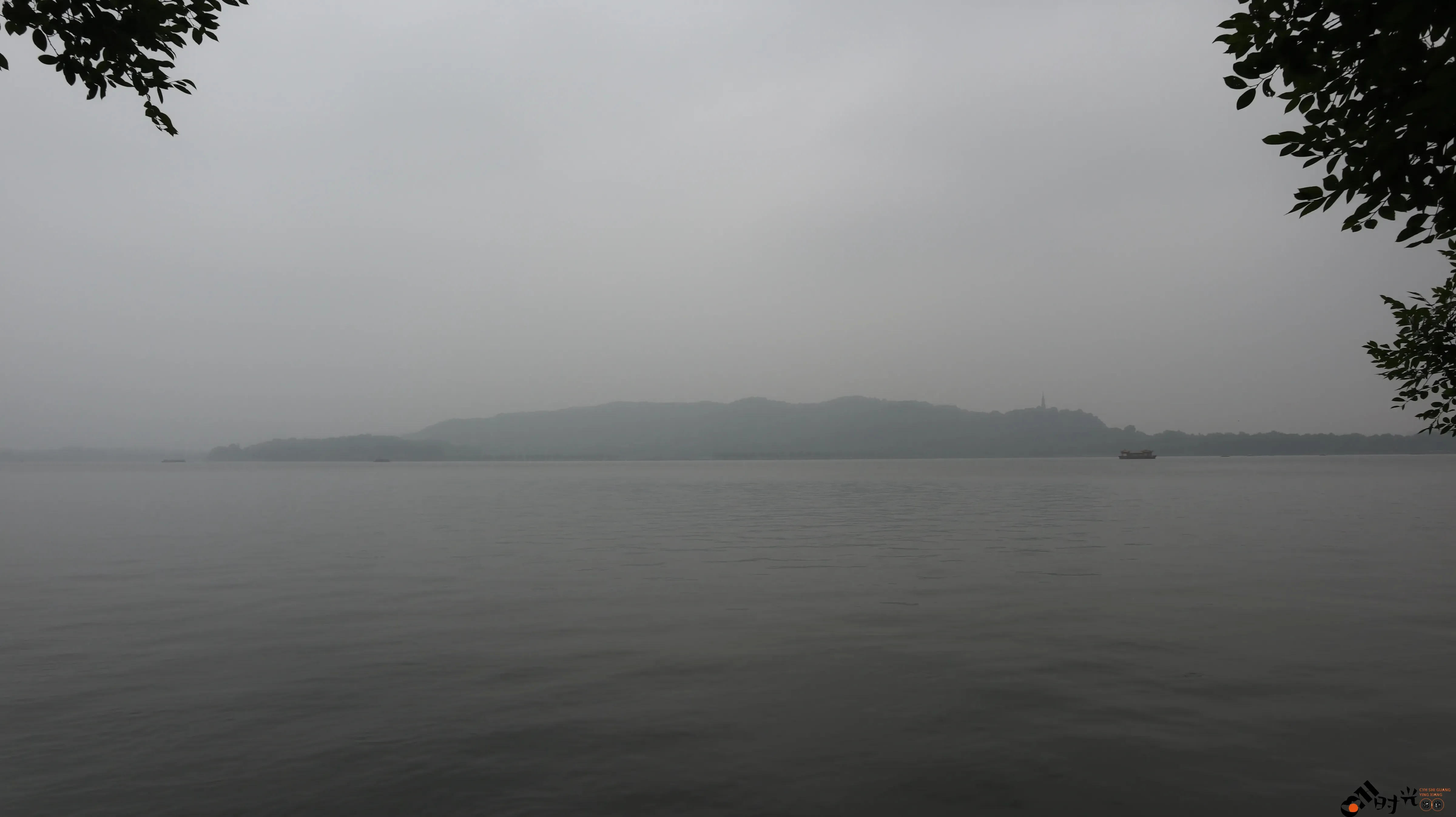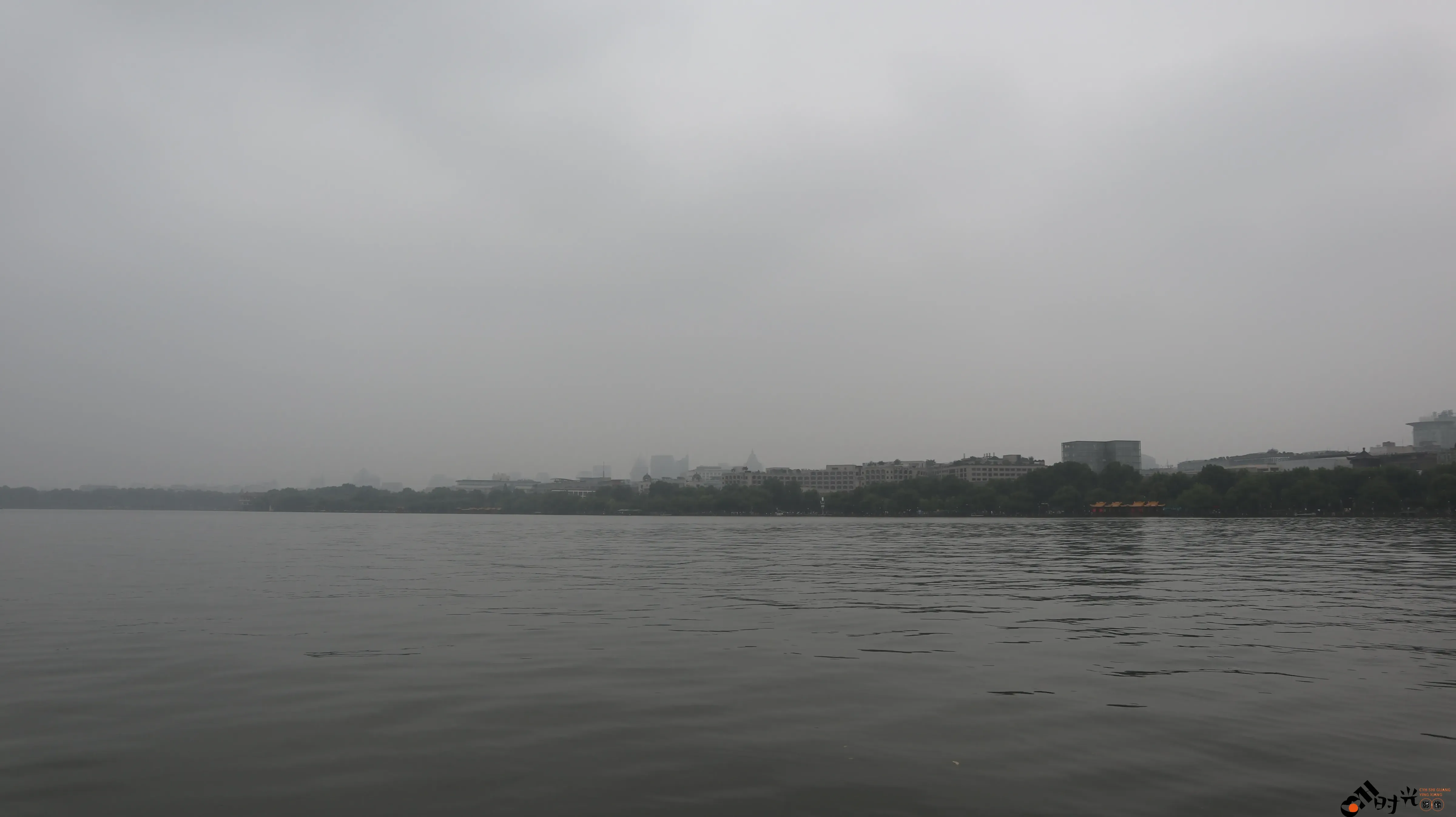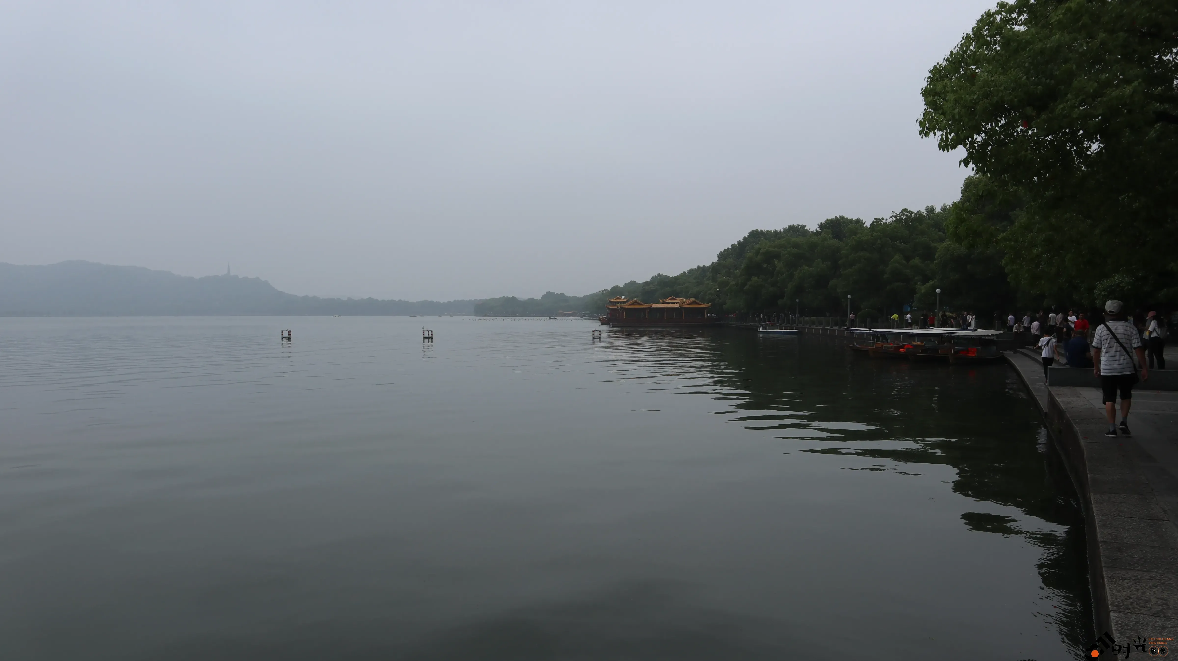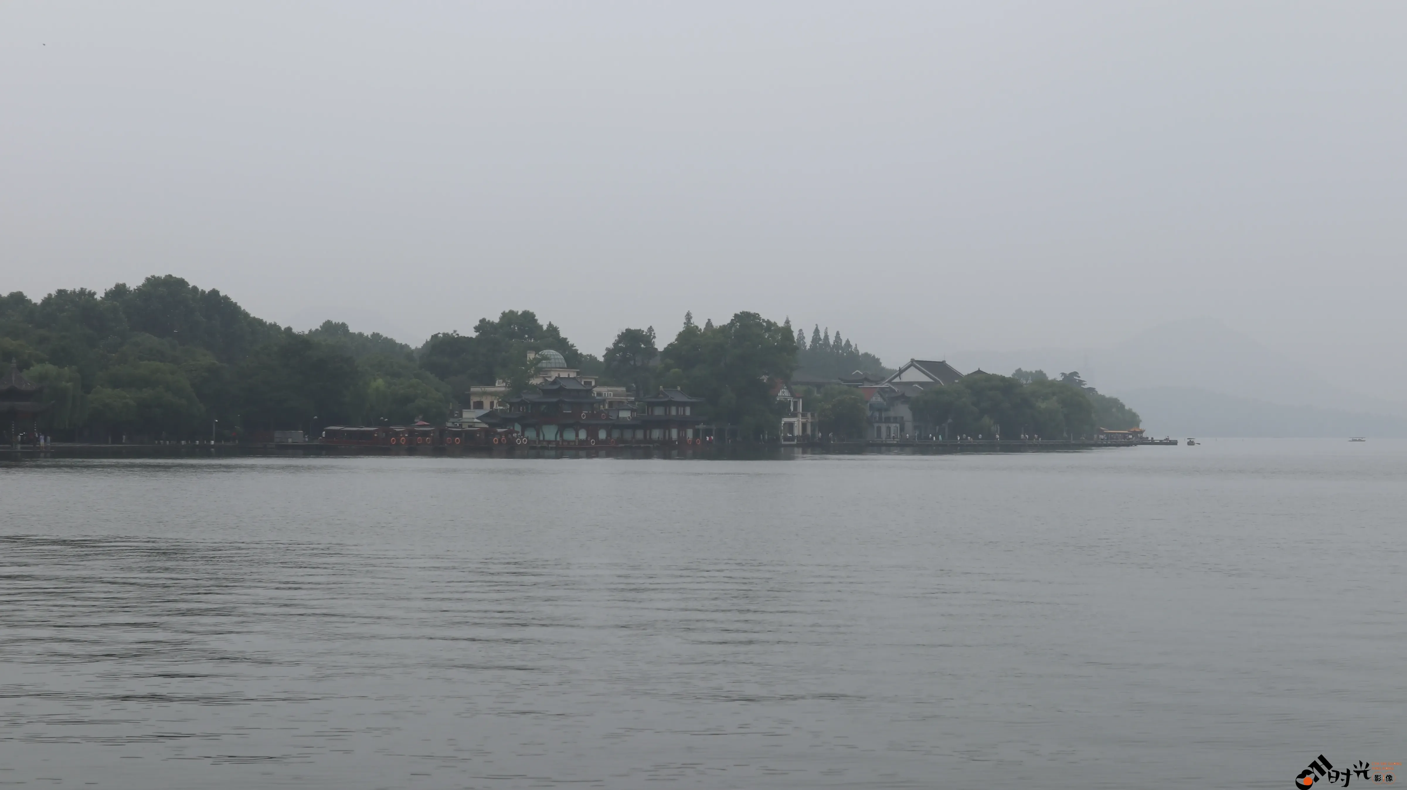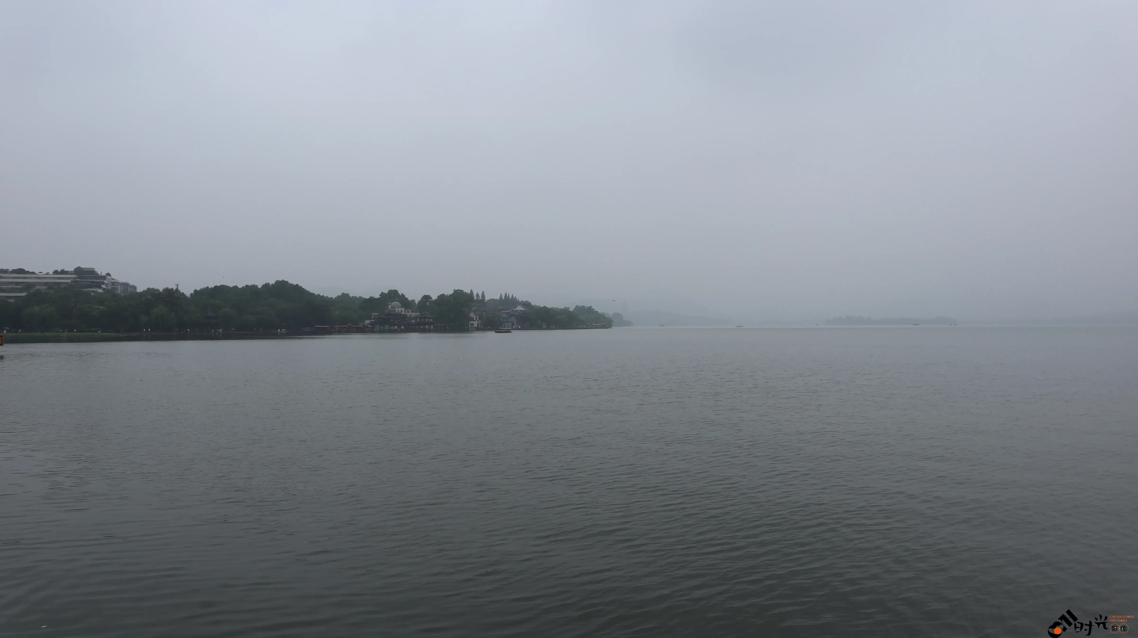 阴雨天下的杭州西湖湖面景色