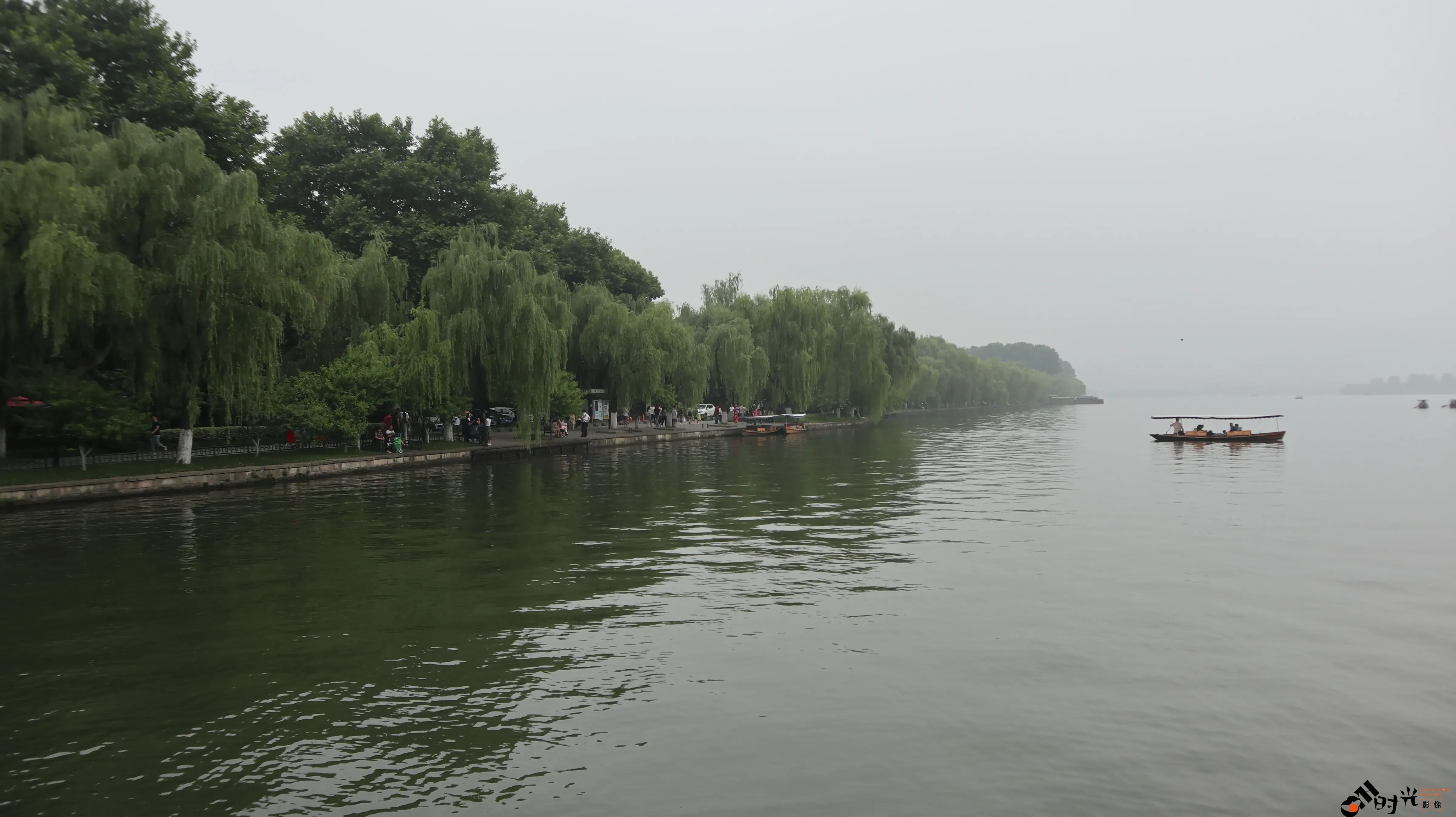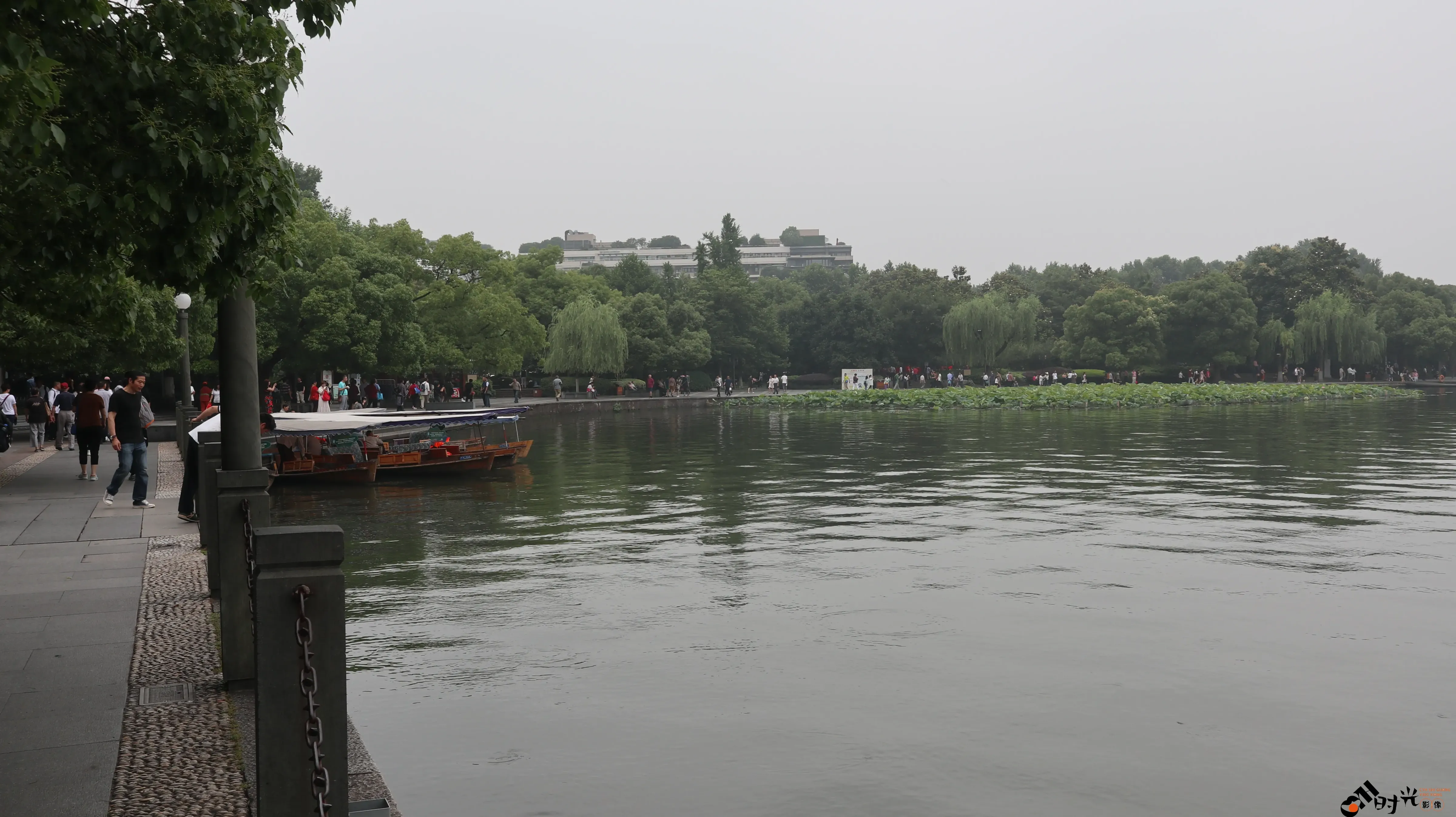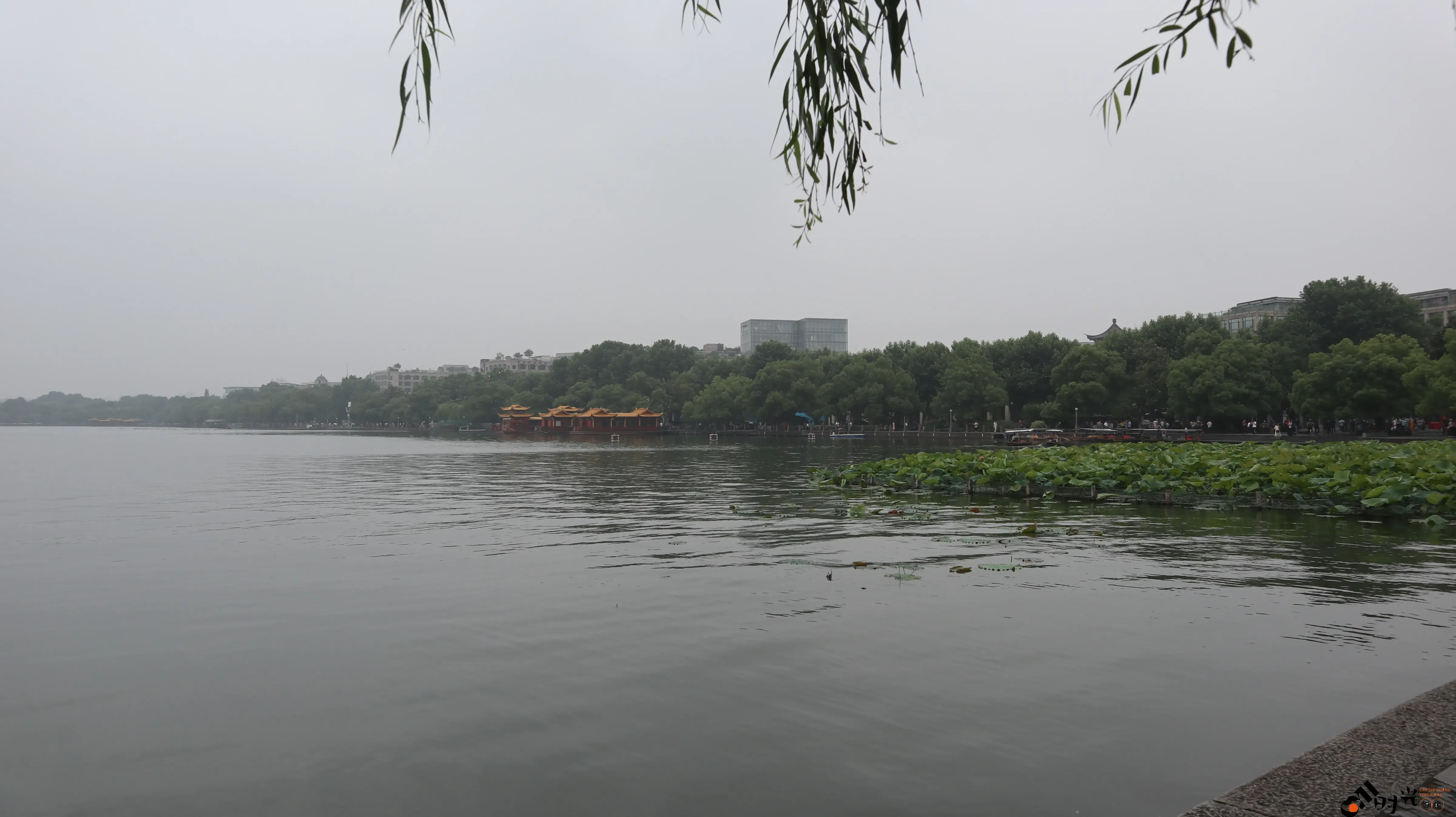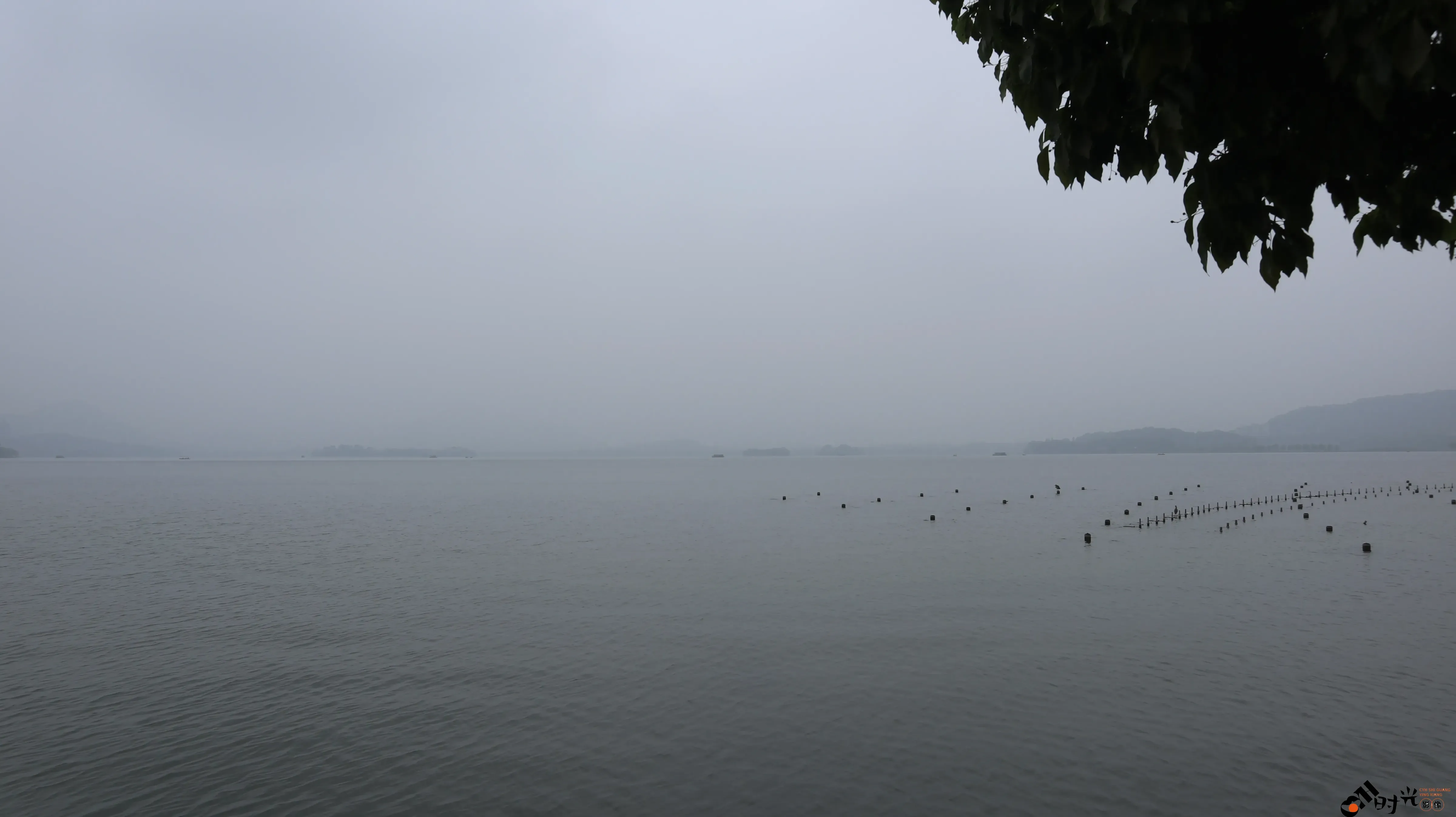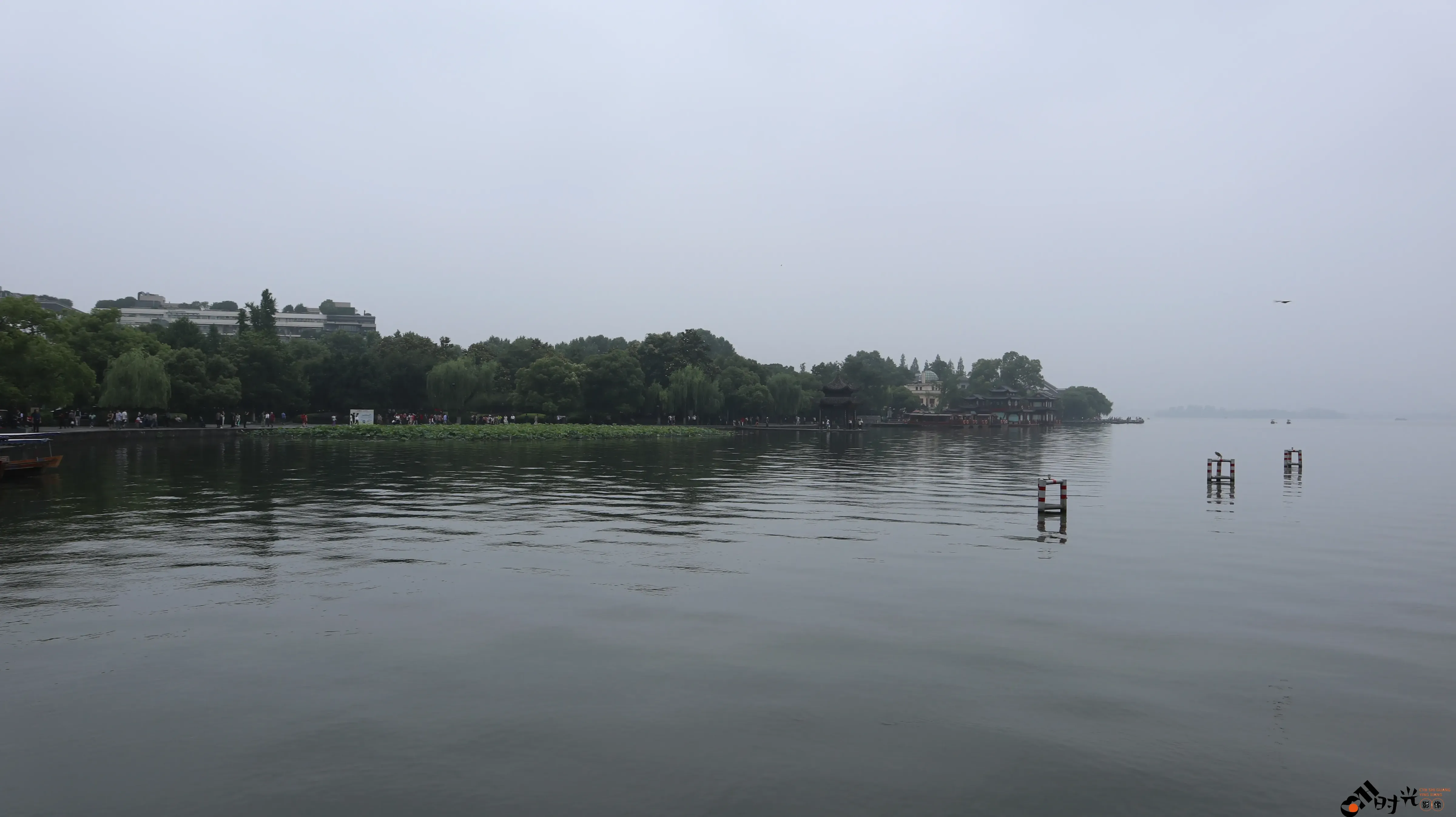 阴雨天下的杭州西湖湖面景色